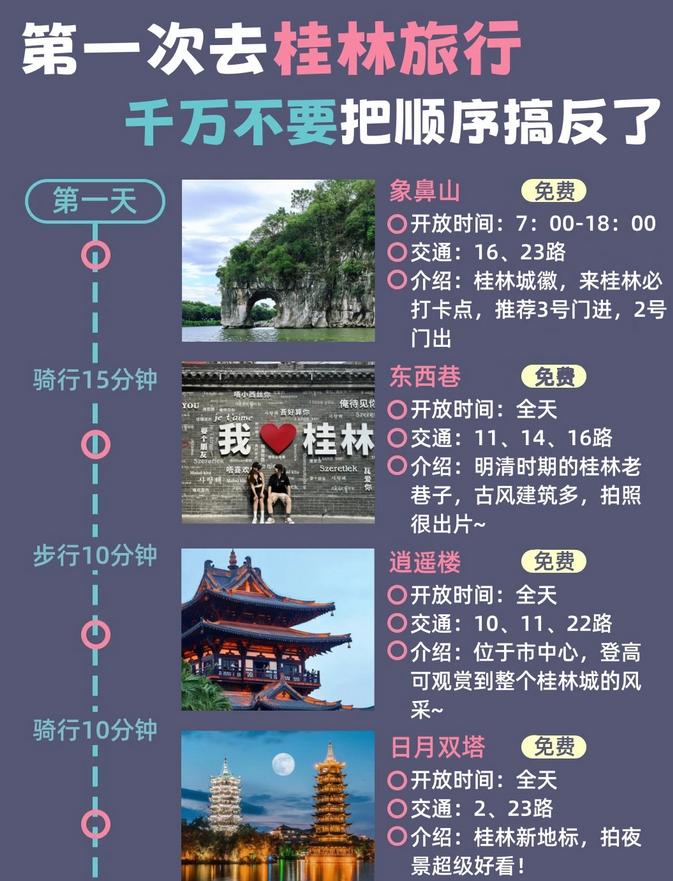 ✔️在桂林市区游玩一天就足够了,精华的景点在阳朔,建议大家花2-3天在阳朔游玩哦