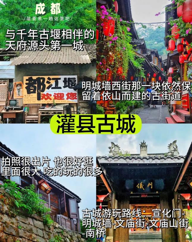 🔺灌县古城:穿过南桥就可以到达灌县古城,这里范围广阔,由多个街道组成。古城内有许多美食小吃,可以去文庙街拍照,非常上镜。