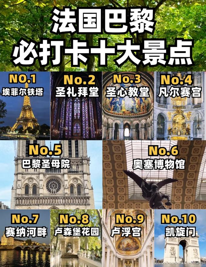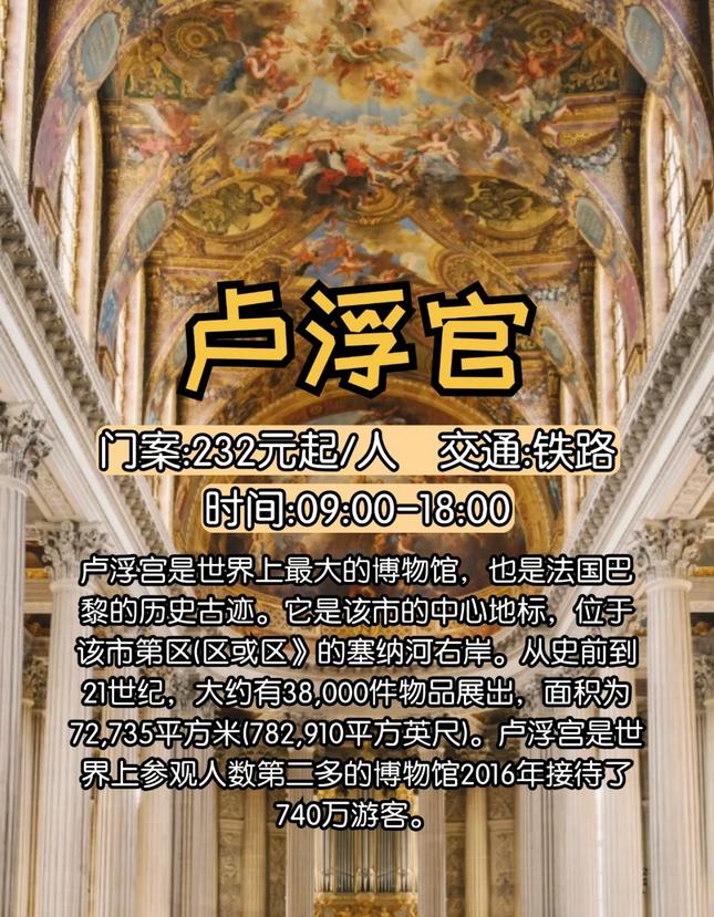 作为全球四大博物馆之首,卢浮宫内收藏了超过40万件艺术珍品,其中包括“世界三宝”——断臂维纳斯雕像、胜利女神雕像和《蒙娜丽莎》油画。🖼️ 建议游玩时间:2-3小时。