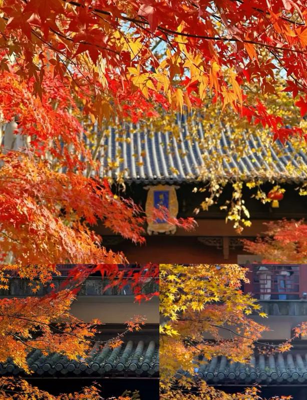 在秋天,栖霞山的森林被绚丽的色彩装点,溪水潺潺,鸟儿在山中歌唱。古老寺庙的钟声和鼓声在山间回荡,香火旺盛。两棵古老的银杏树在秋风中轻轻摇曳,金黄的叶子如同一幅美丽的画卷飘落。🎨