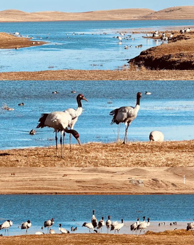 🦩黑颈鹤栖息地大海子:大海子是濒危物种黑颈鹤的栖息之地。每年冬季,成群的黑颈鹤从北方飞来越冬,它们的身影在蓝天、白云和湿地草原的映衬下,构成了一幅和谐美丽的画面,让人感受到大自然的生机与活力💕