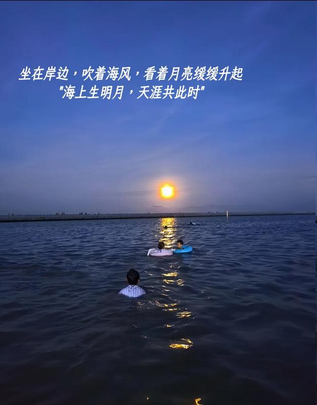 1.三娘湾(停车费10元):下午抵达三娘湾的游泳区,由于设有防浪堤,海面相对平静,非常适合游泳~岸边的商家提供桌椅(20-30元/张),可以在这里悠闲地欣赏日落和月出🌙,十分惬意!