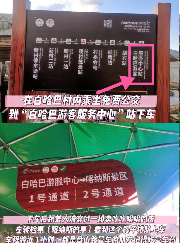 ——在白哈巴乘坐村内免费公交车到“白哈巴游客服务中心”下车,途经一排餐饮店,见到厕所后,左边就是喀纳斯景区票验票口,凭身份证入园。