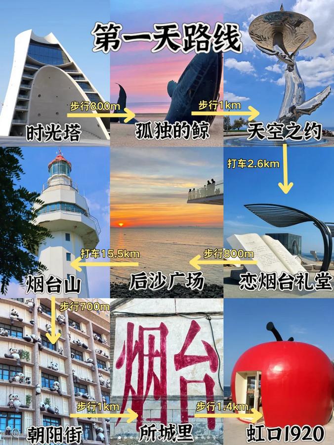 𝗗𝗮𝘆𝟭:时光塔➡️孤独的鲸➡️天空之约➡️恋烟台礼堂➡️后沙广场➡️烟台山➡️朝阳街➡️所城里➡️虹口1920