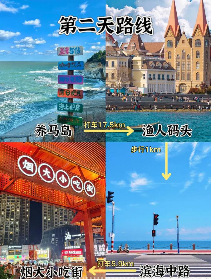 𝗗𝗮𝘆𝟮: 养马岛:被称为烟台的“马尔代夫”,海水清澈如果冻,建议租借电动车环岛骑行,沿途有通往海边的小路、海岛日记、海岛来信的悬崖小屋等美景。 滨海中路:这是一条通往海洋的治愈之路,红绿灯和斑马线交错,蓝色的海岸线如同“日系漫画街”。 渔人码头:海鸥、码头和海洋构成了美丽的风景,仿佛置身于布拉格,前往对面的虞美人广场,可以拍到全景,游客相对较少,更加适合拍照。