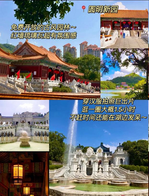 1️⃣圆明新园:这是一座免费开放的传统园林~红墙与琉璃瓦的搭配极具氛围,穿上汉服拍照效果特别好,游览大约需要1.5小时,如果不着急的话,还可以在湖边悠闲地发呆~