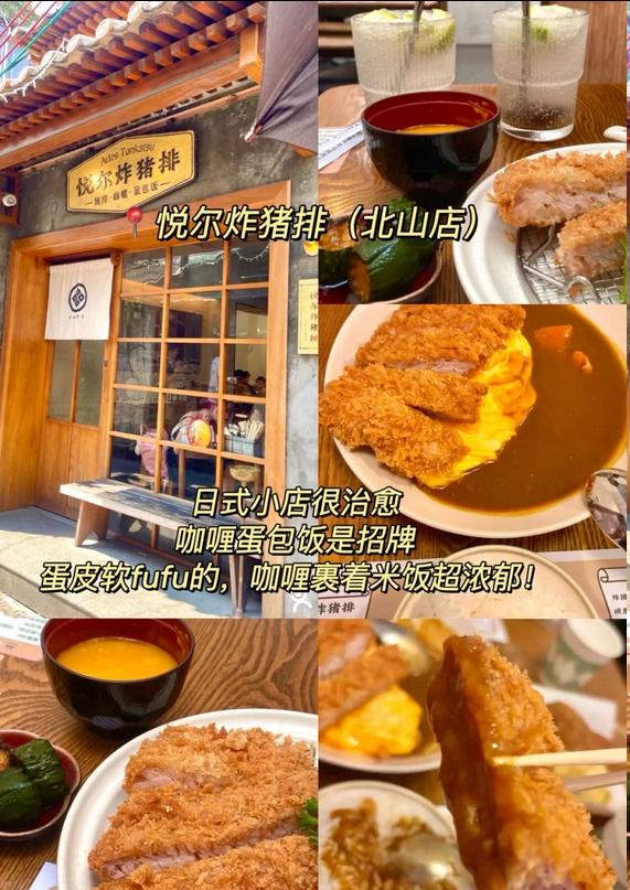 3️⃣悦尔炸猪排(北山店):这是一家日式小店,氛围很治愈,招牌是日式咖喱蛋包饭,蛋皮软嫩,咖喱裹着米饭的味道浓郁,猪排外酥里嫩!
