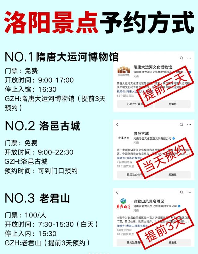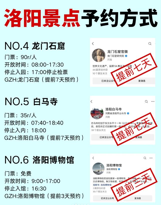 龙门石窟、白马寺、洛阳博物馆、隋唐大运河博物馆、洛邑古城、老君山