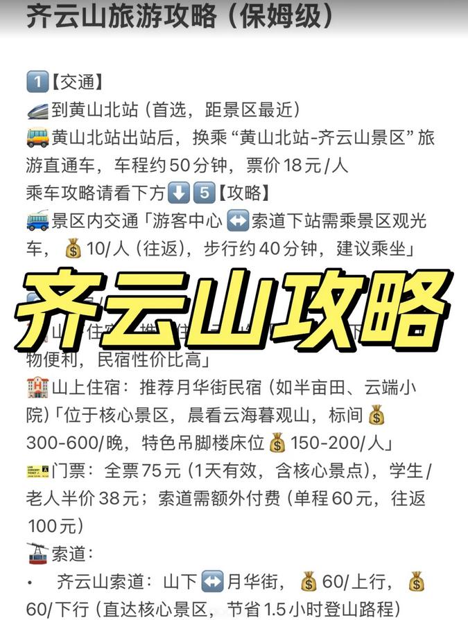 1️⃣黄山北站有直通车前往齐云山游客中心,末班车为17:00,若错过可选择打车,费用约为100元