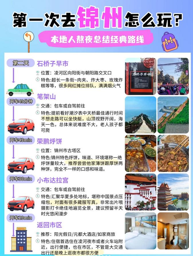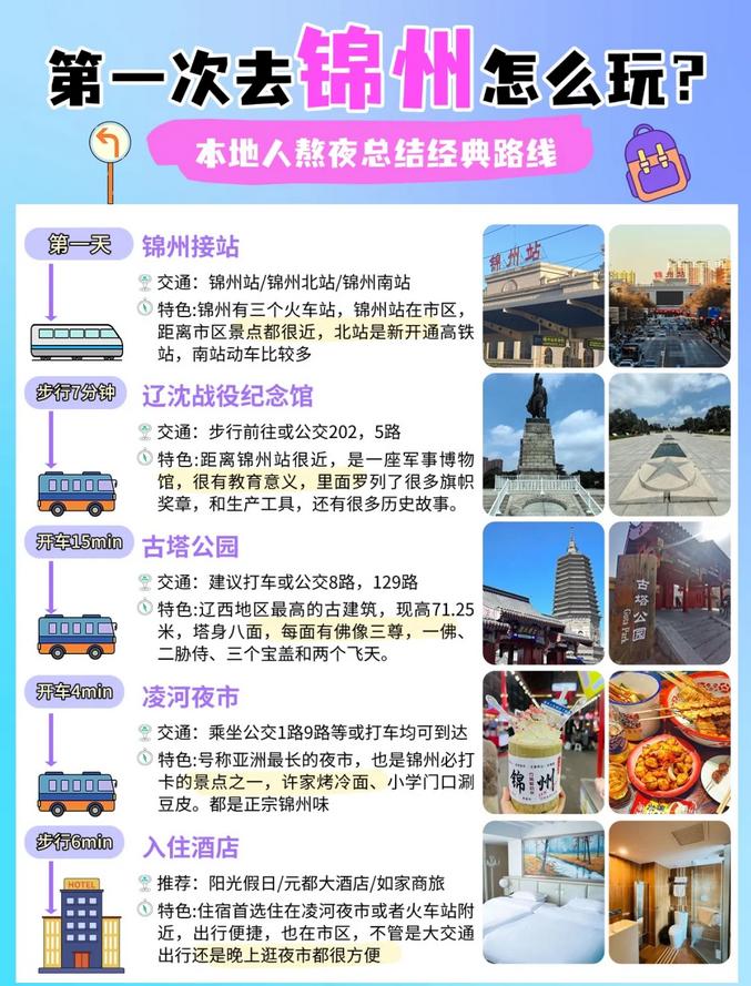住宿:建议选择市中心区域(如凌河或古塔区),例如假日阳光和如家酒店,这里交通便利且靠近夜市。