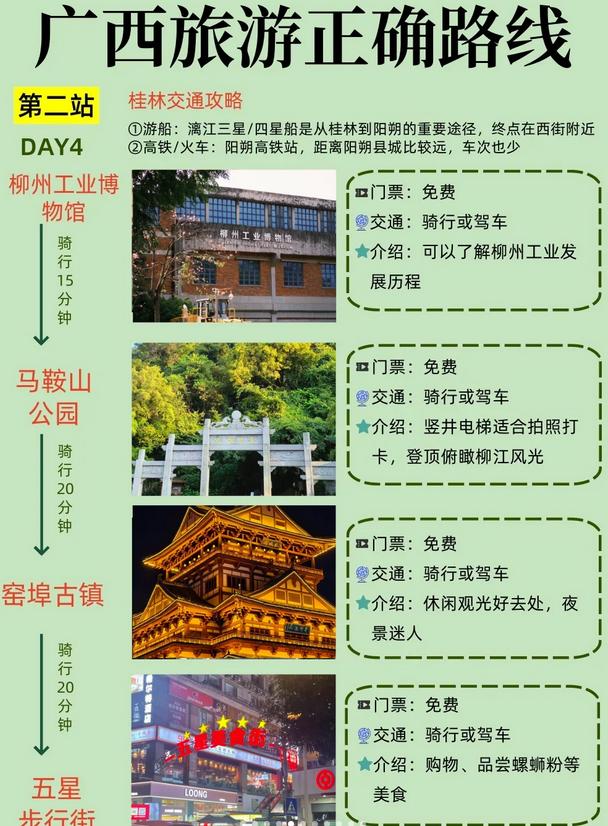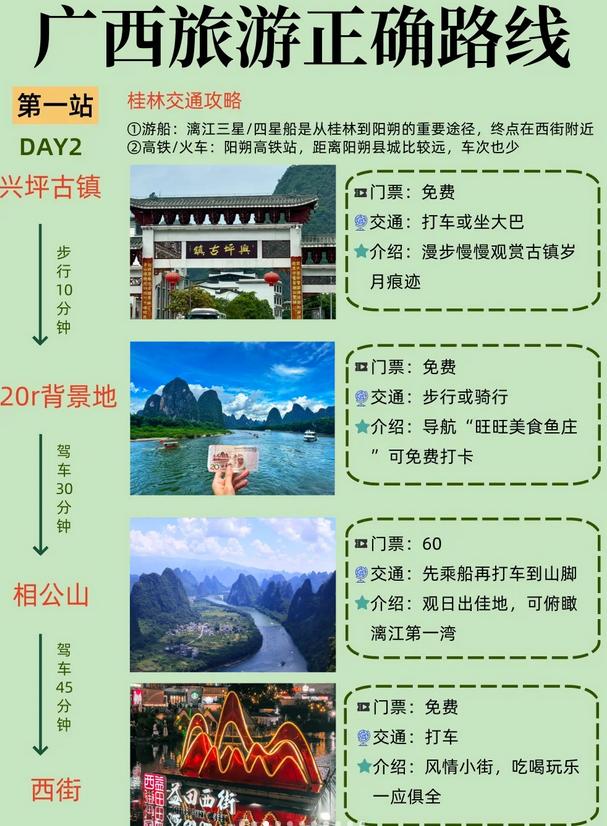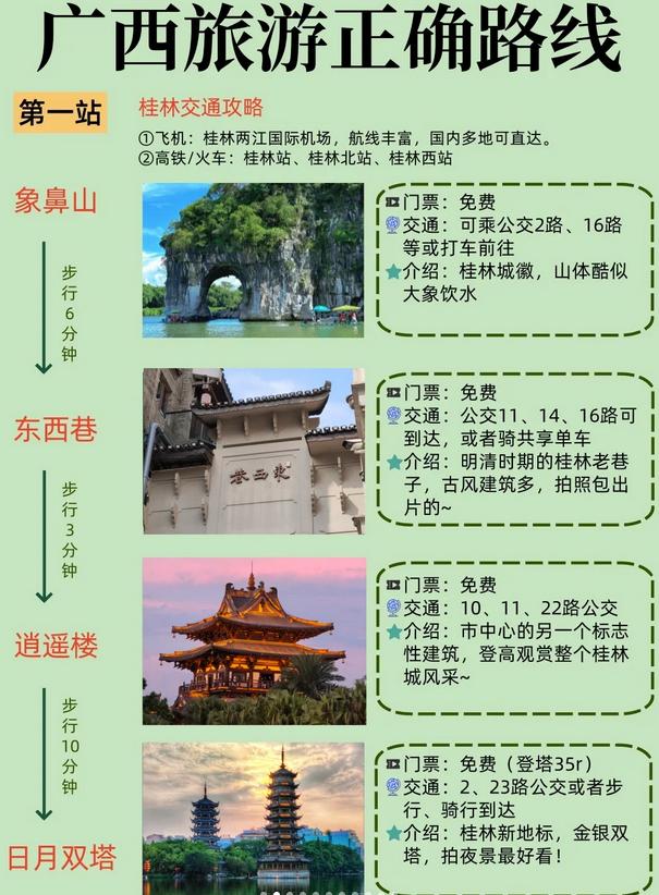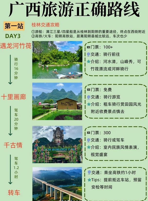 当地交通:桂林公交每次2元,阳朔电动车租赁15-20元/天,北海打车建议使用网约车以防宰客。