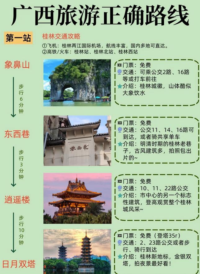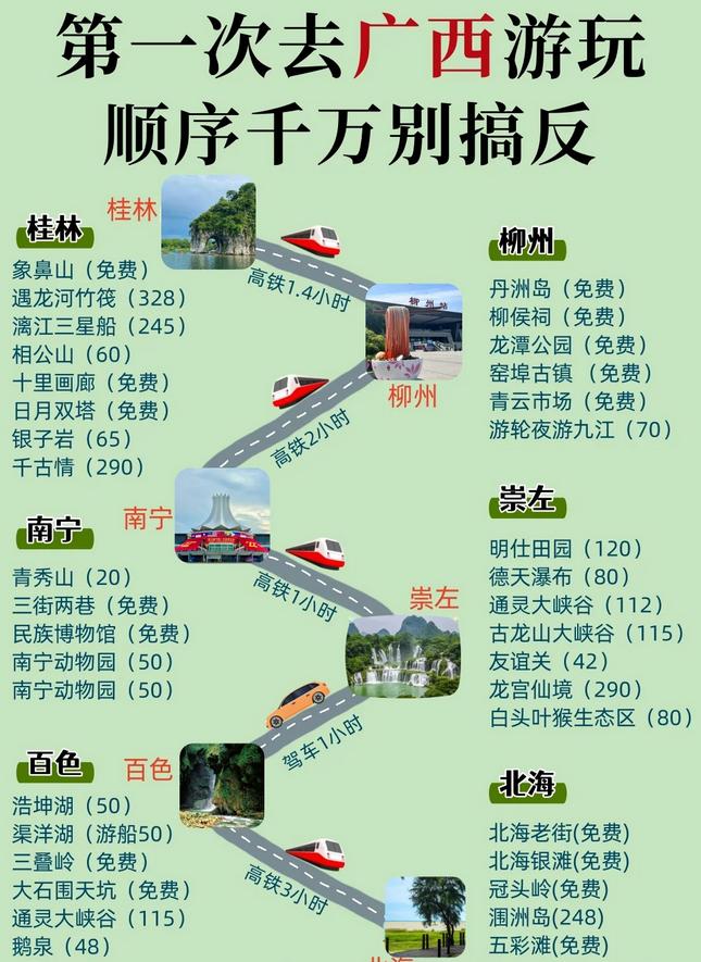 跨城交通:从南宁到桂林的高铁约需1.5小时,桂林到阳朔的大巴车也需1.5小时,而柳州到北海的高铁大约需要3小时。