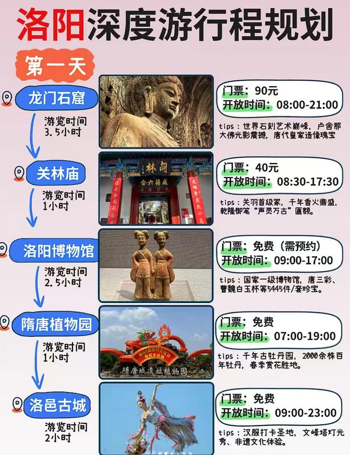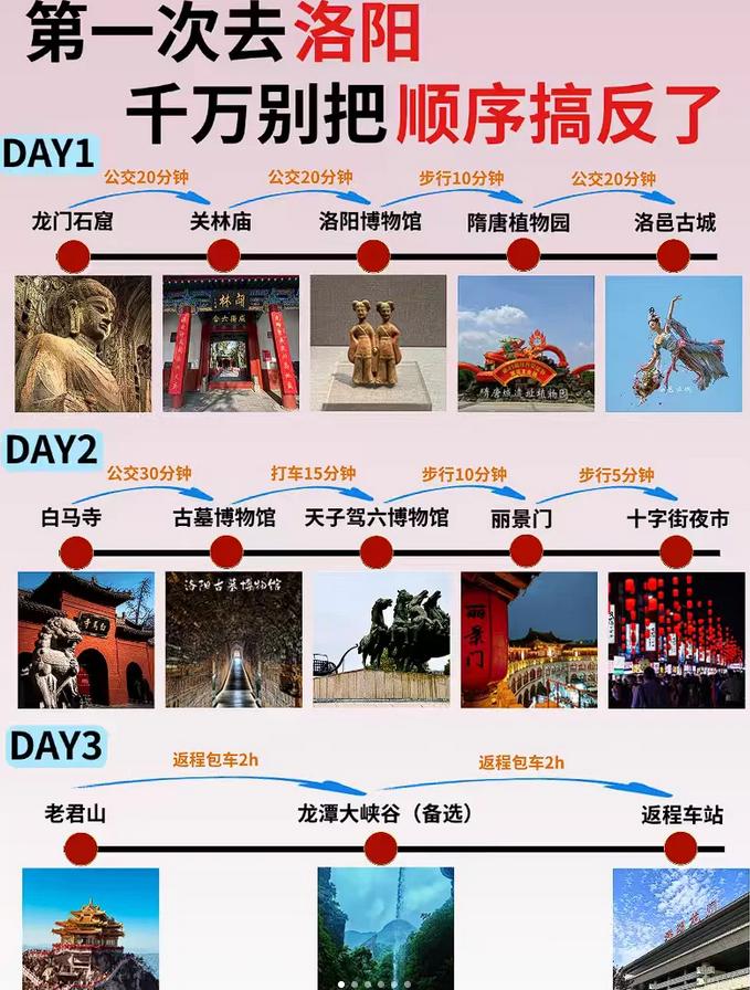 📍龙门石窟→📍关林庙→📍洛阳博物馆→📍隋唐植物园→📍洛邑古城