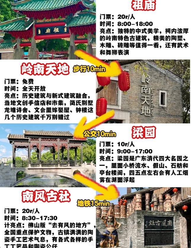 1️⃣祖庙-🚶🏻步行10分钟-岭南天地-🚌公交10分钟-梁园-🚇地铁15分钟-南风古社