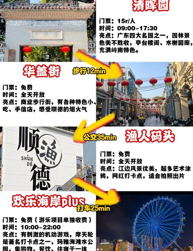 2️⃣清晖园-🚶🏻步行12分钟-华盖街-🚌公交35分钟-渔人码头-🚕打车25分钟-欢乐海岸plus