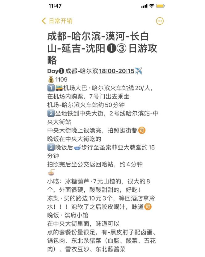 旅行路线:成都-哈尔滨-漠河-哈尔滨-长白山-延吉-沈阳-成都,总时长为13天