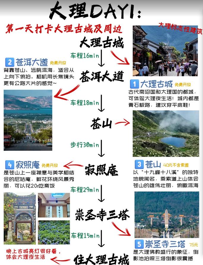 大理古城→苍洱大道→苍山→寂照庵→崇圣寺三塔→入住大理古城(晚上古城的灯光非常美,感受大理的夜生活)