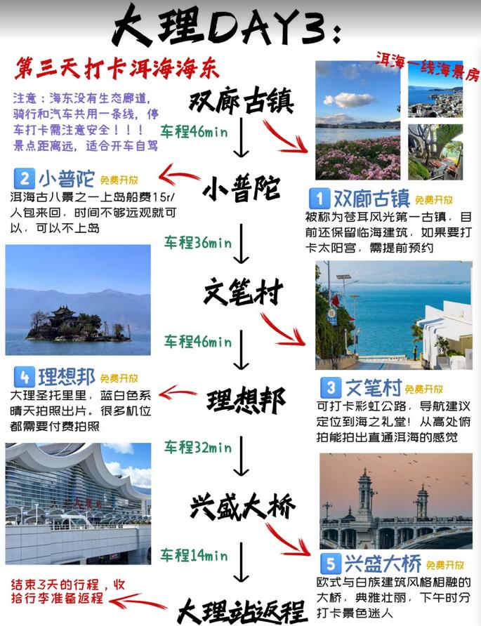 双廊古镇→小普陀→文笔村→理想邦→兴盛大桥→大理站返程