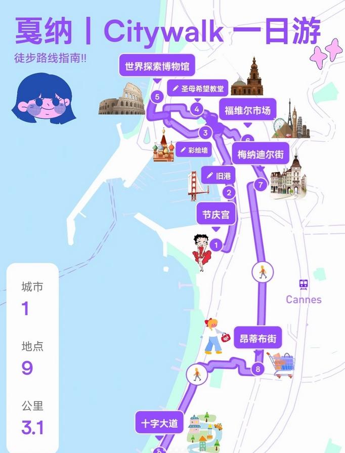 🔁徒步路线:节庆宫—旧港—彩绘墙—圣母希望教堂—世界探索博物馆—福维尔市场—梅纳迪尔街—昂蒂布街—十字大道