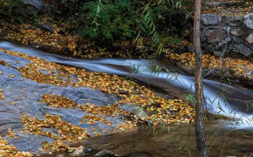 秋天,落叶纷纷,小溪就像一位浪迹天涯回乡寻祖的老人,身披一件金光灿灿的礼服。微风轻拂,水面荡起层层的波纹,就像老人展开那布满皱纹的笑脸。